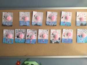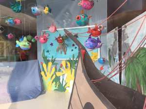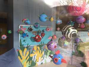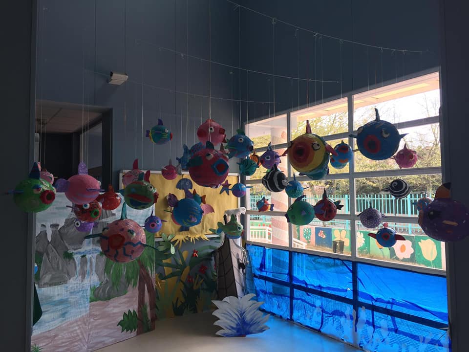 Mirad las obras de arte que hacen los chavales en la extraescolar de Arte y Creatividad. Han convertido el hall del cole en una auténtica pecera!!!