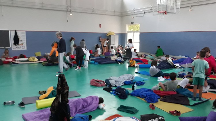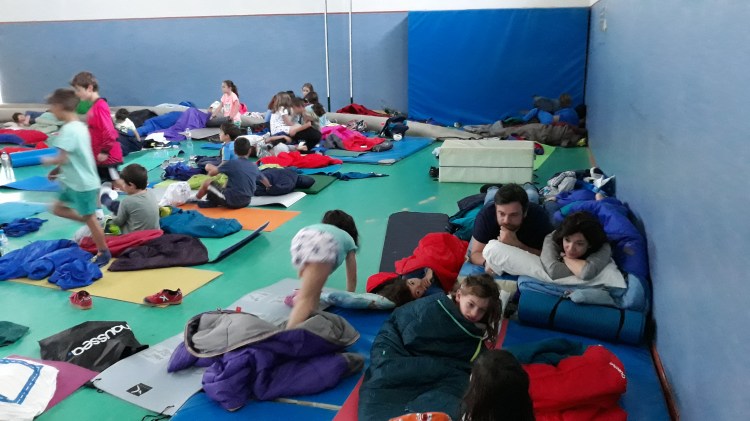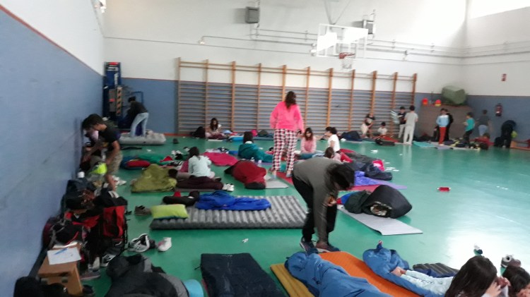 A eso de las 23:45 fuimos apagando las luces del gimnasio para ir durmiendo poco a poco. Los más pequeños cayeron enseguida, pero los más mayores… ay los más mayores, no callaron en toda la noche.