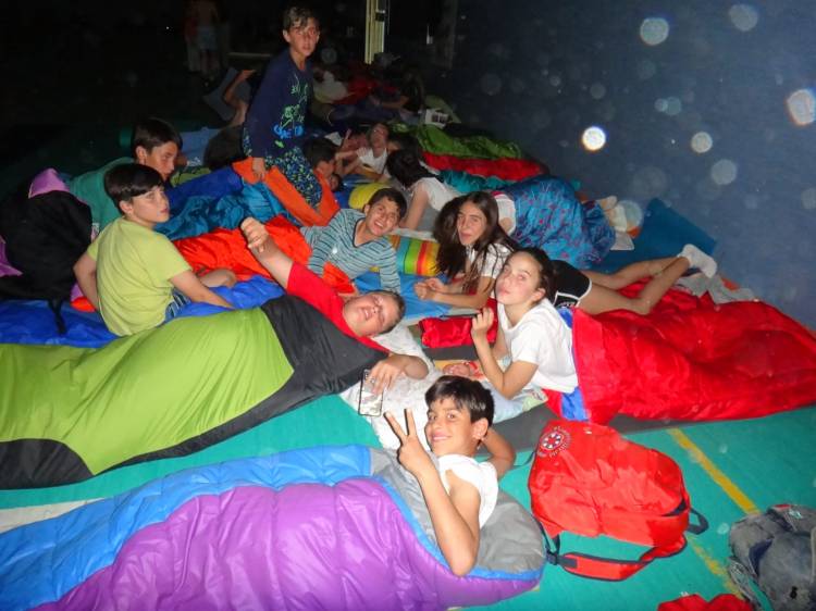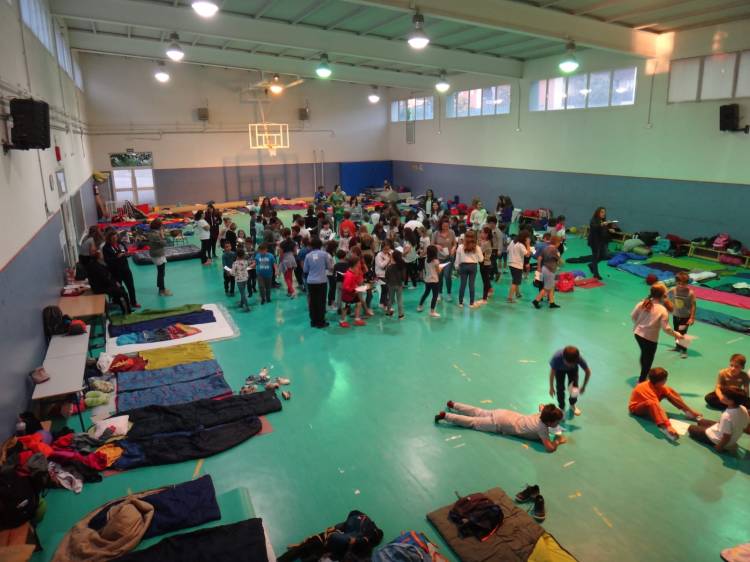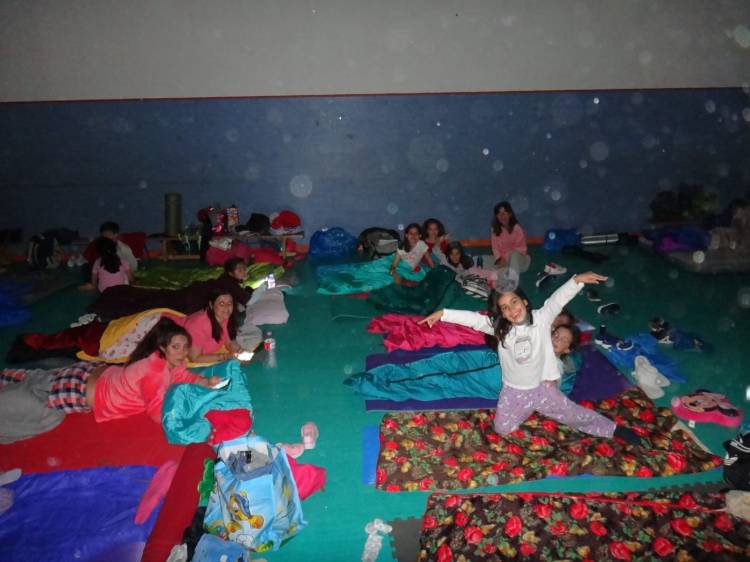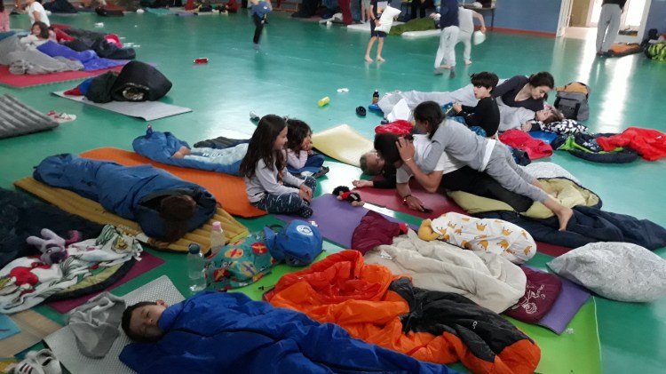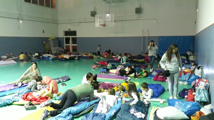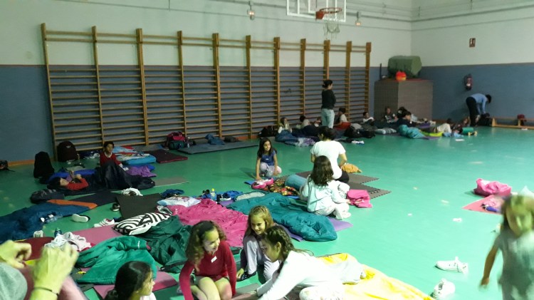 A eso de las 23:45 fuimos apagando las luces del gimnasio para ir durmiendo poco a poco. Los más pequeños cayeron enseguida, pero los más mayores… ay los más mayores, no callaron en toda la noche.
