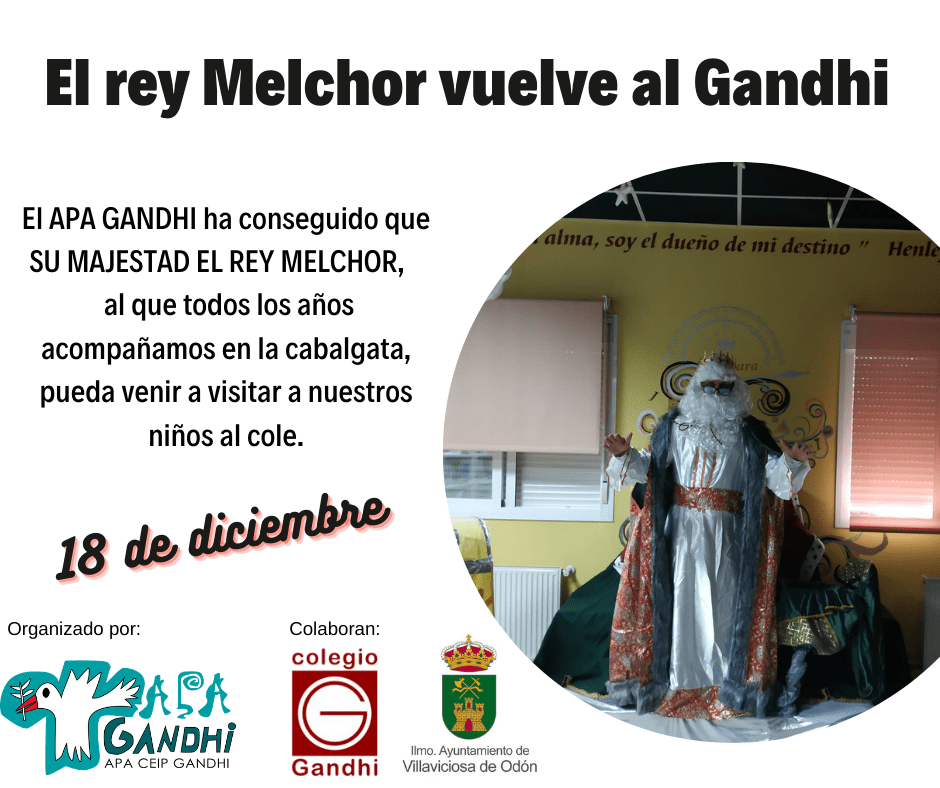 El próximo 18 de diciembre, no os olvidéis que este año, aunque raro, seguirá siendo ESPECIAL, y para ello el APA GANDHI ha conseguido que SU MAJESTAD EL REY MELCHOR, al que todos los años acompañamos en la comitiva de la cabalgata, pueda venir a visitar a nuestros niños al cole.